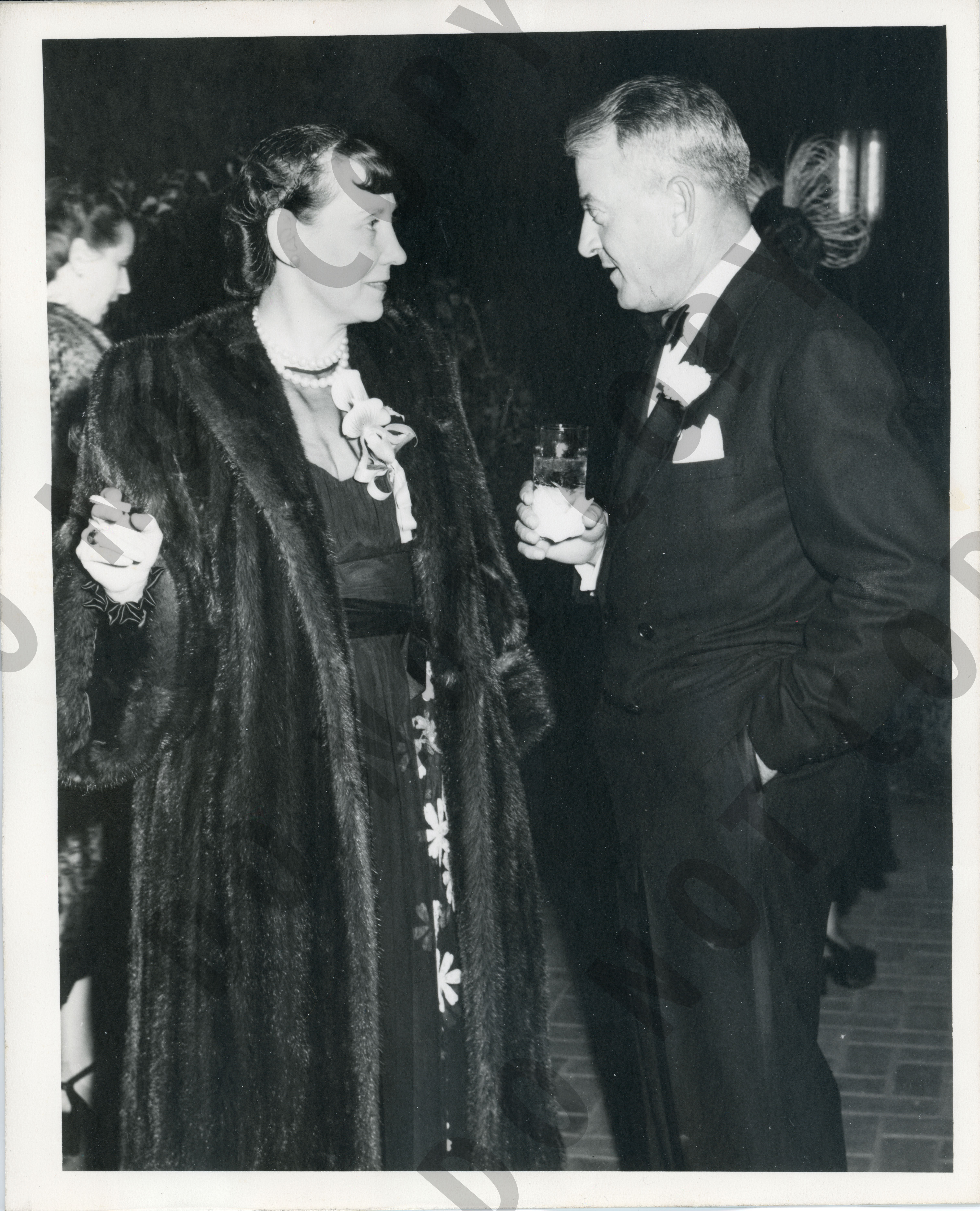 Photo of Mamie Eisenhower and an unidentified man at a dinner and reception honoring the Eisenhowers.