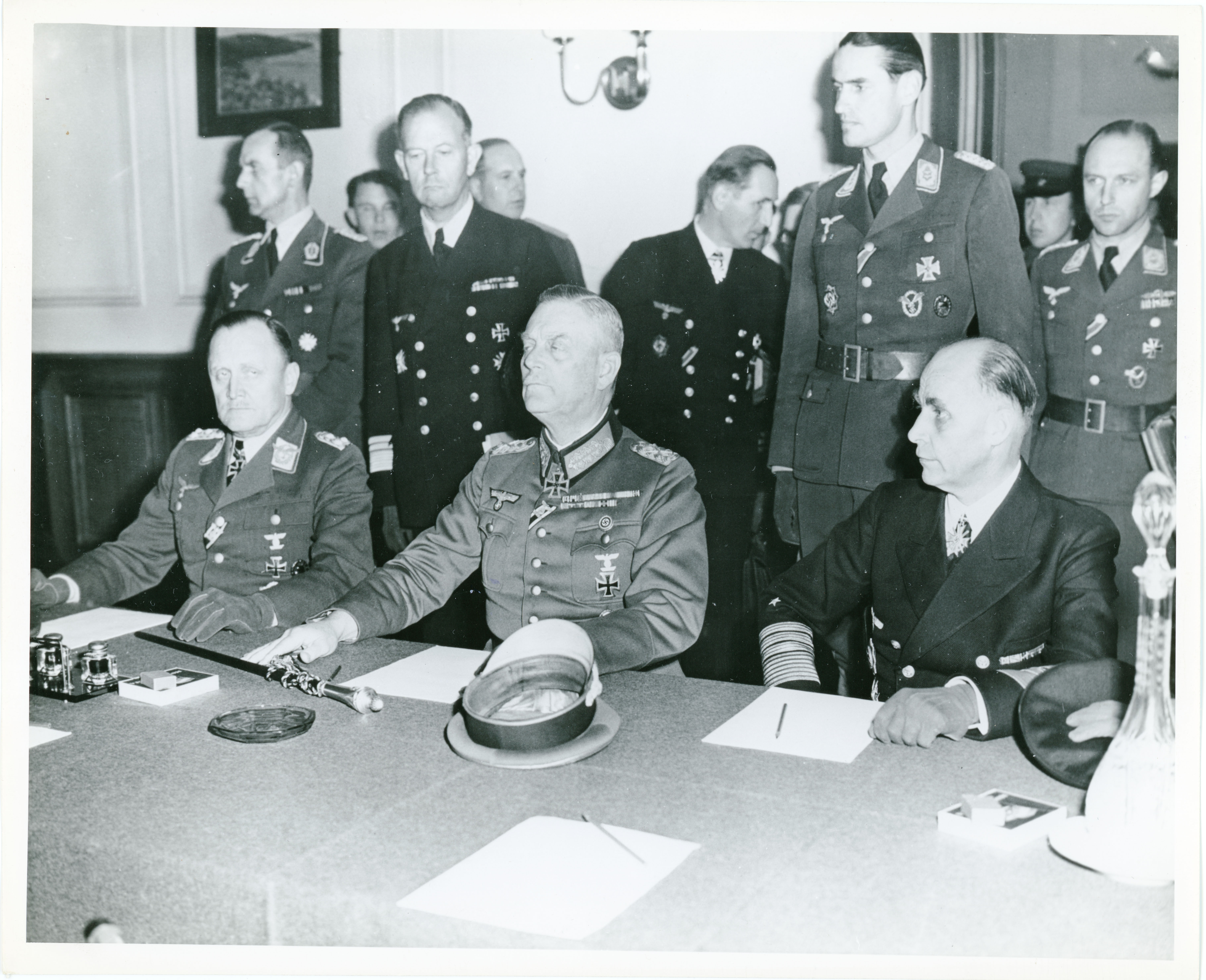On reverse: "ETO HQ 45 27428 7 MAY CREDIT….SIGNAL CORPS PHOTO PHOTOG….LT MOORE 3908 L-R; COL GENERAL P STUMPF, C IN C OF THE LUFTWAFFE; FIELD MARSHALL WILHELM KEITEL, GERMAN ARMY; AND GENERAL ADMIRAL HANS GEORG FREIDBURG C IN C OF THE GERMAN FLEET AT RUSSIAN HEADQUARTERS IN BERLIN, JUST BEFORE THEY SIGNED THE RATIFIED SURRENDER TERMS AGREED UPON AT REIMS. (14) CERTIFYING AS BEING PASSED BY OFFICE CHIEF PRESS CENSOR HEADQUARTERS ETOUSA ARMY PICTORIAL SERVICE BY P."