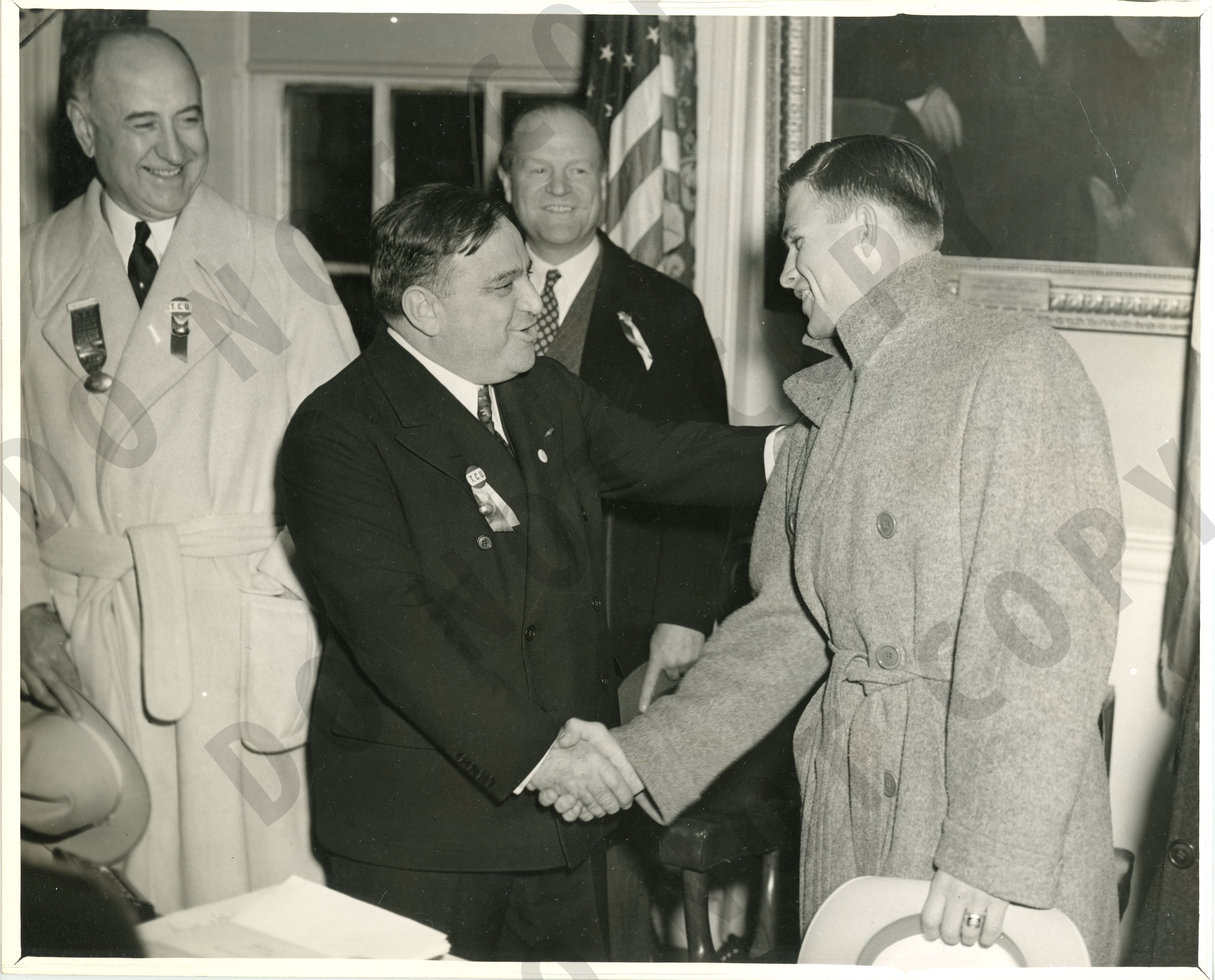 Photo of Amon Carter, New York City mayor Fiorello LaGuardia, an unidentified man and Davey O'Brien shaking hands when O'Brien was in New York to receive the Heisman Trophy.