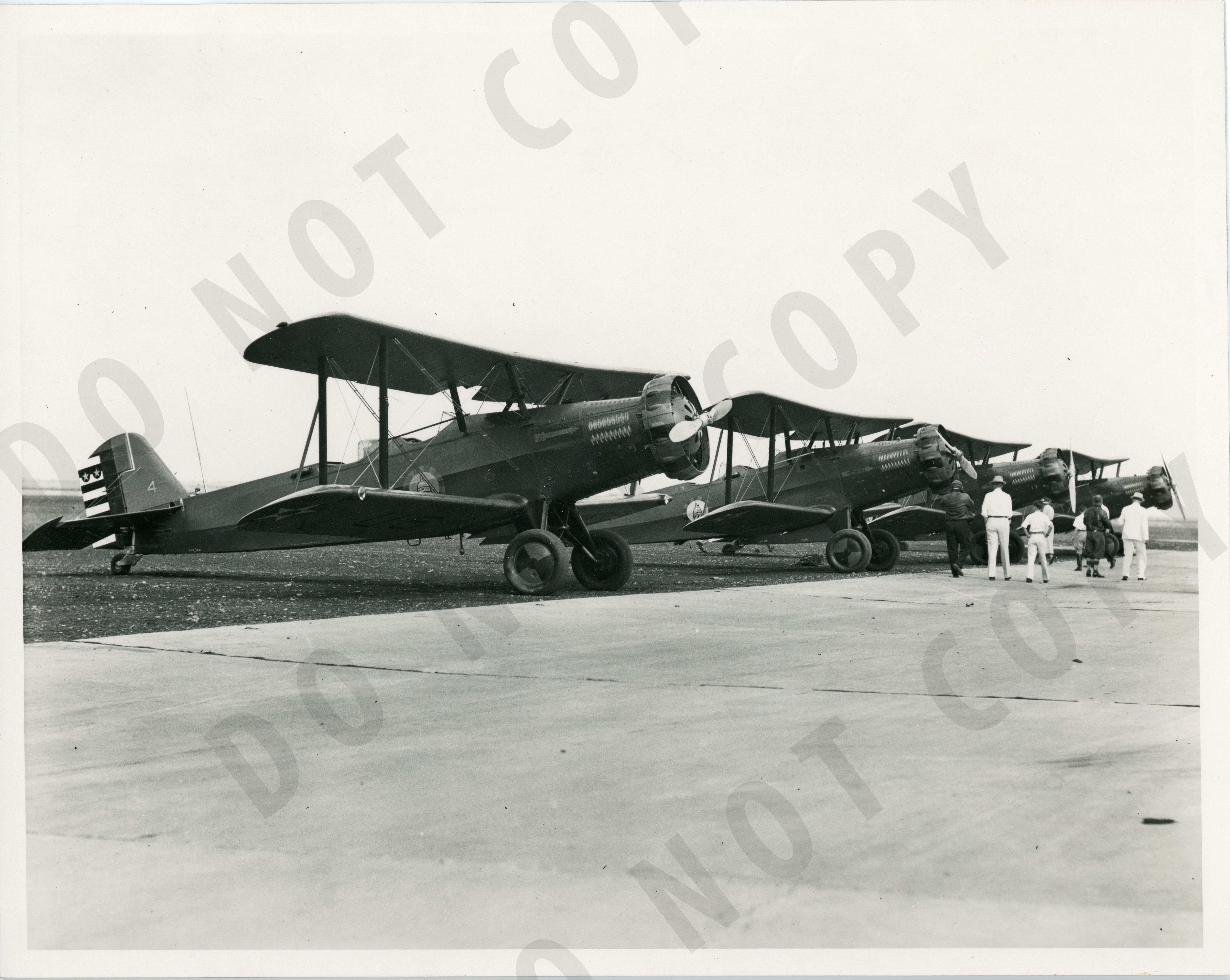 Maj. Gen. B. D. Foulois at airport with other Army Flying officers, walking in front of a row of biplanes. Amon Carter far right.