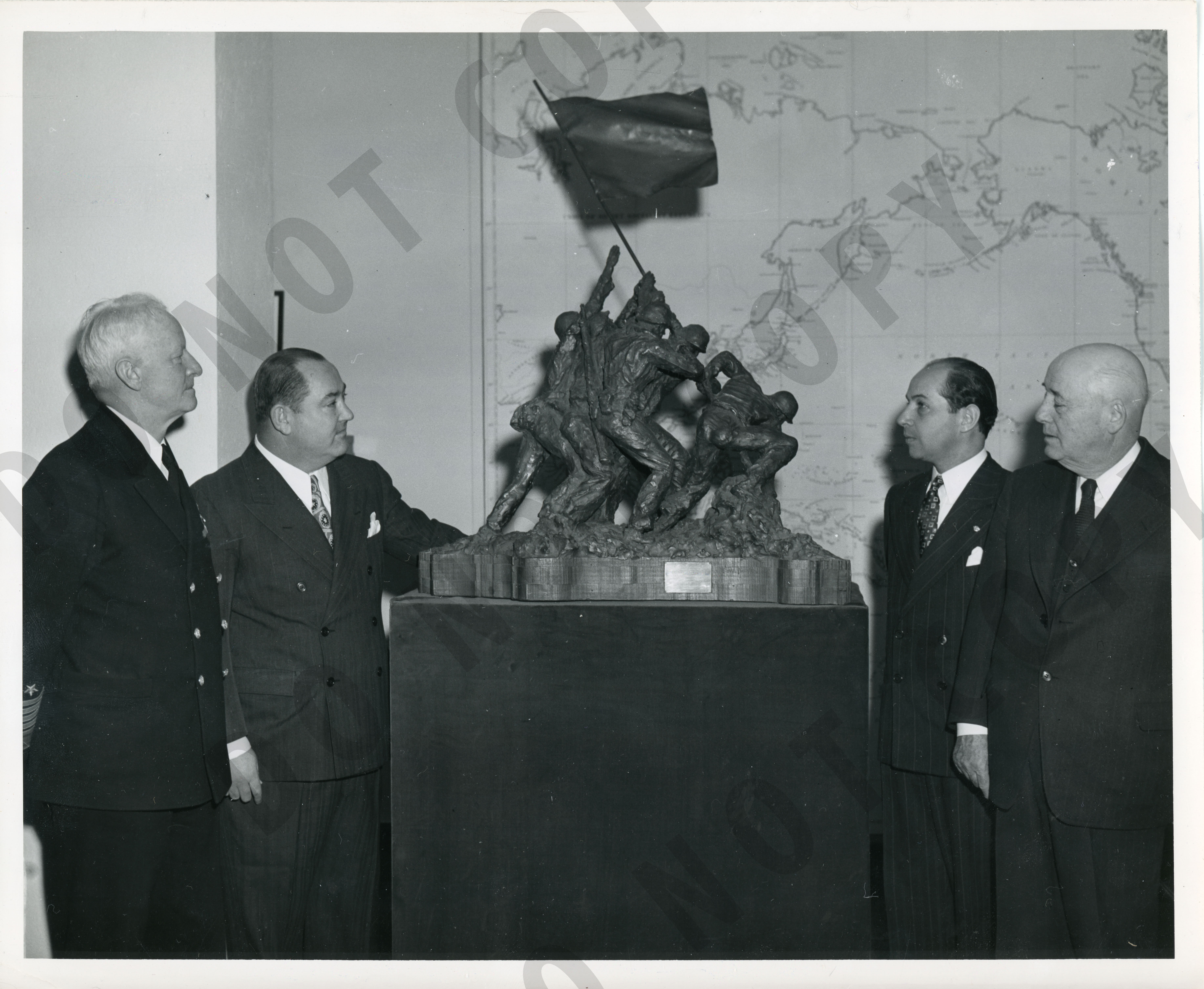 On reverse: "FILE NUMBER: 702042 RELEASED: 2 March 1946 TEXAS SOCIETY PRESENTS IWO JIMA STATUE MODEL TO FLEET ADMIRAL NIMITZ: The original model of the Iwo Jima statue that stands in front of the Navy Building, on Constitution Avenue, in Washington, by Feliz de Welden, Washington sculptor, was presented by the Texas State Society of Washington to Fleet Admiral Chester W. Nimitz, of Fredericksburg, Texas, at a ceremony at the Navy Department March 2. Presentation was made by Ralph Pittman, Society President, formerly of DeLeon, Texas, following a talk by Speaker of the House Sam Rayburn, Bonham, Texas. In acceptance, Adm. Nimitz asked his fellow Texans, and 'the rest of the country to realize the importance of remaining strong on the sea.' On the one hundred tenth anniversary of Texas independence, Adm. Nimitz reminded that 'the too little known facts are that the strength of the Texas Navy in the Gulf, forced General Santa Ana to march overland, exhausting his supplies and resources, and making his army much easier prey for the armies of General Sam Houston.' Sculptor de Weldon, former Navy Specialist (Painter, Second Class), began his sketches for the Iwo Jima statue within 24 hours after the island was secure. Left to right, Fleet Adm. Nimitz, President Pittman of the Texas Society: Speaker Rayburn and deWeldon."