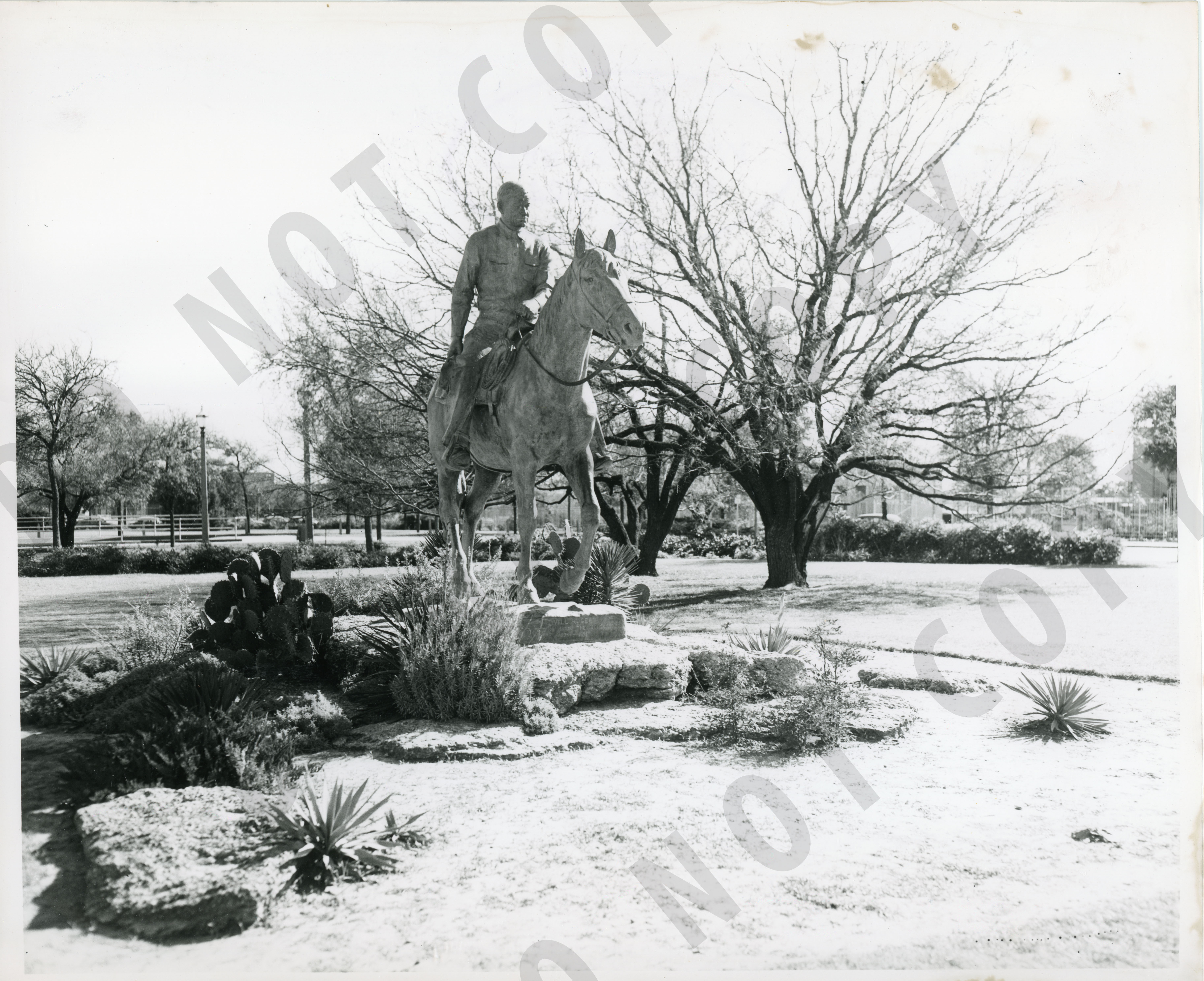Photo of the statue of Will Rogers by Electra Waggoner Biggs in front of Will Rogers Coliseum.
