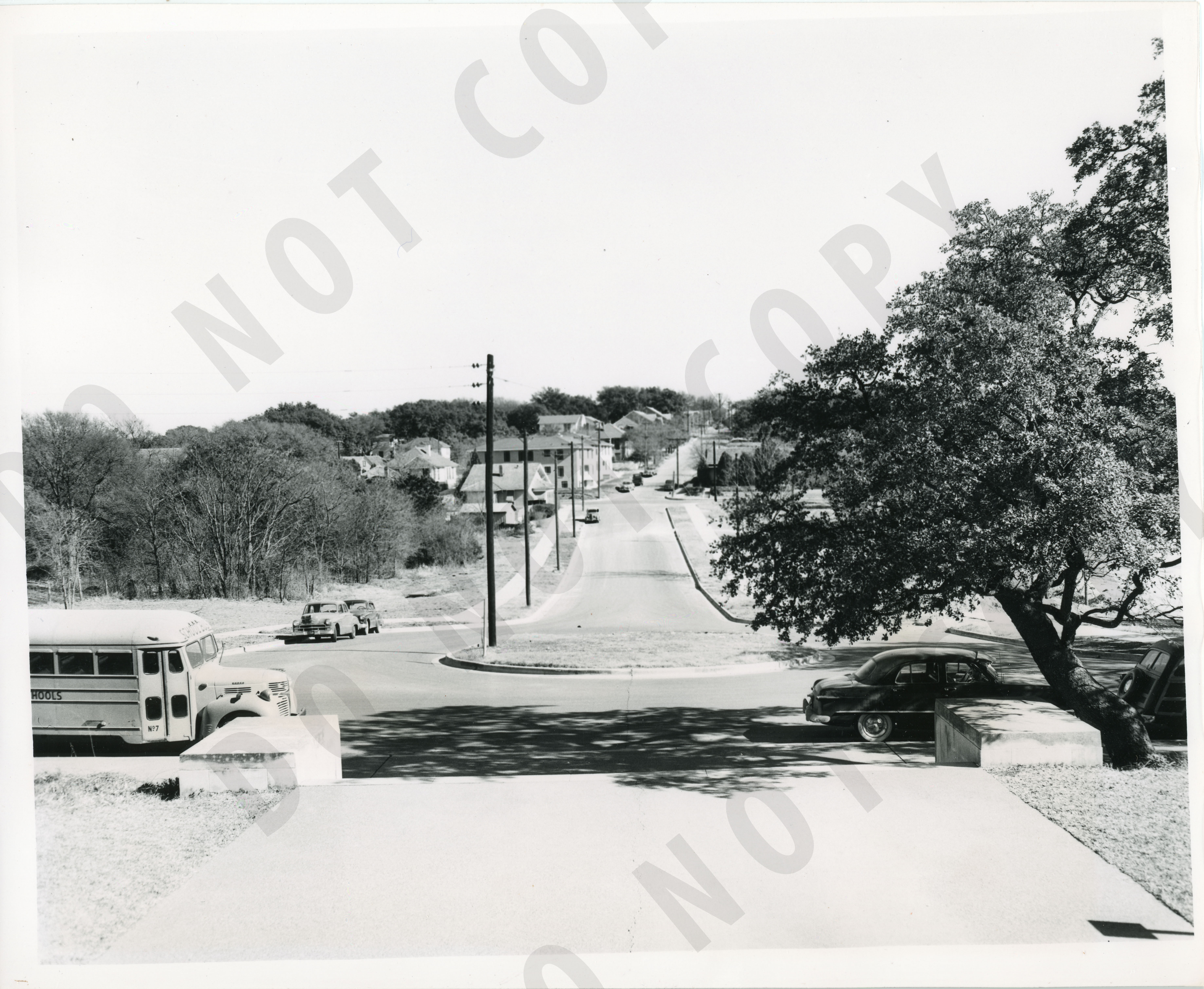 Photo of a street. On reverse: "Looking eastward from steps of Texas Memorial Museum --- site of new law building is over top of bus at left."