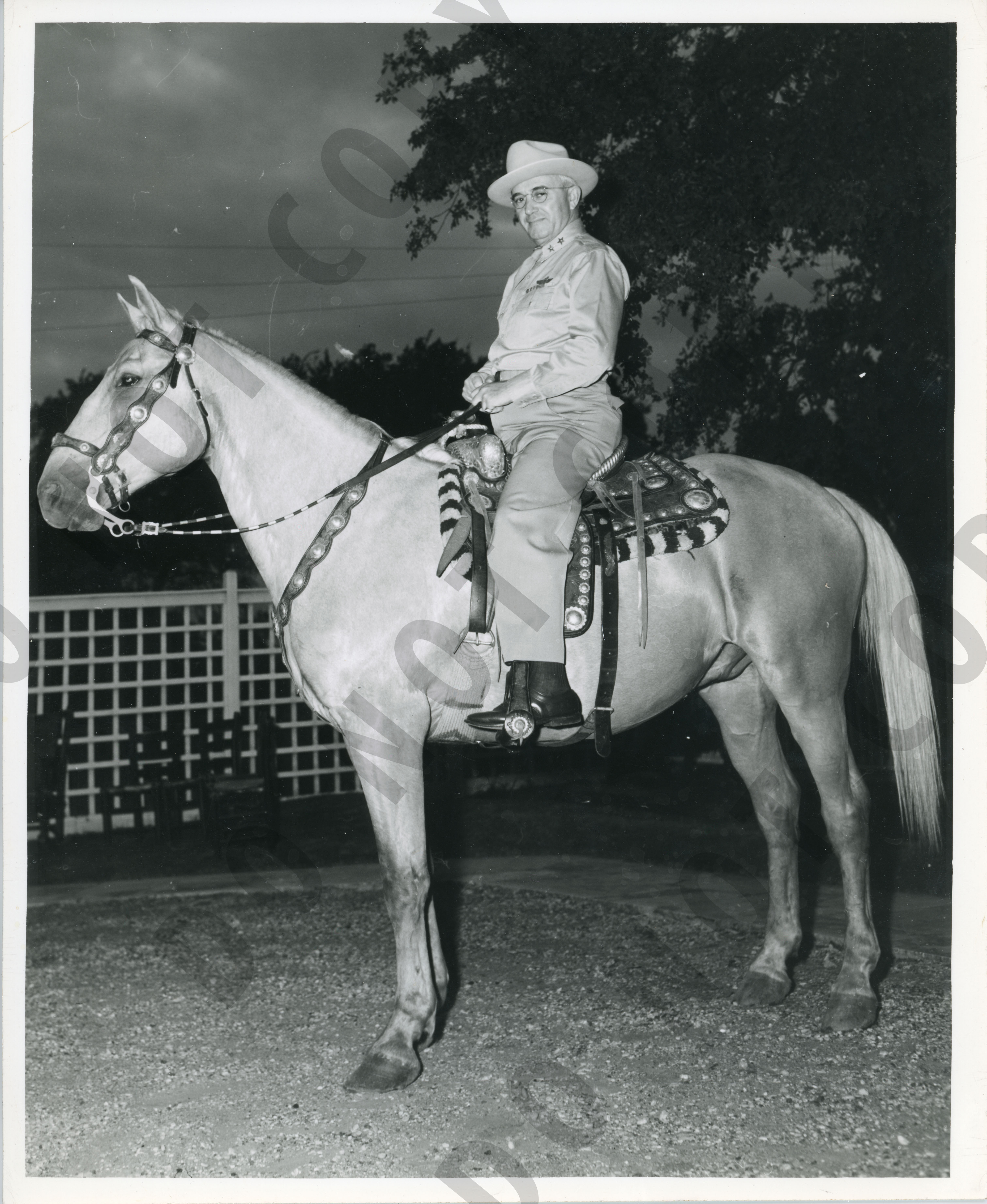 Photo of a man on a horse at a party for American Airlines officials celebrating the inaugural flight to Mexico at Shady Oak Farm.