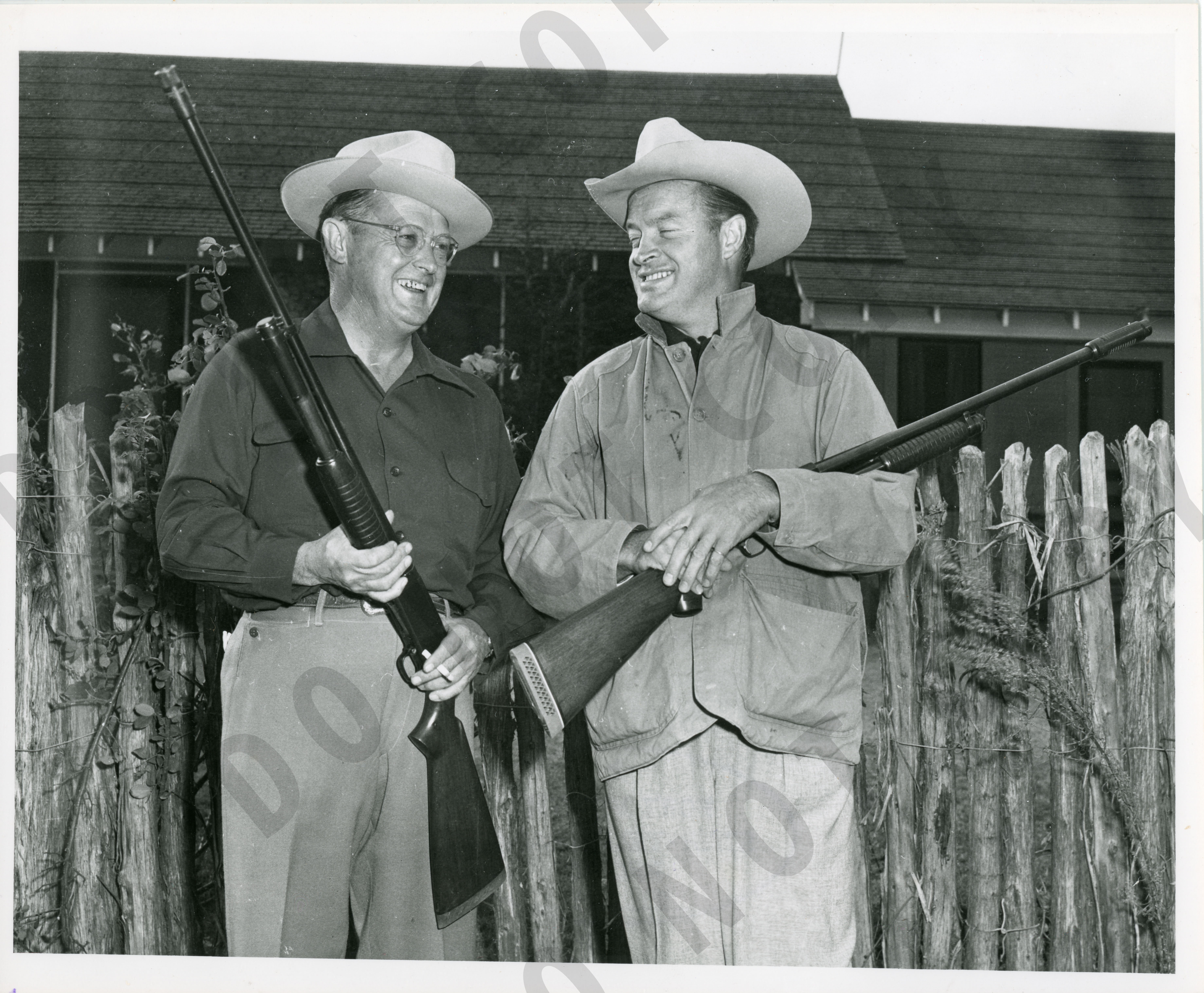 Photo of Bob Hope with another man during a hunting party.