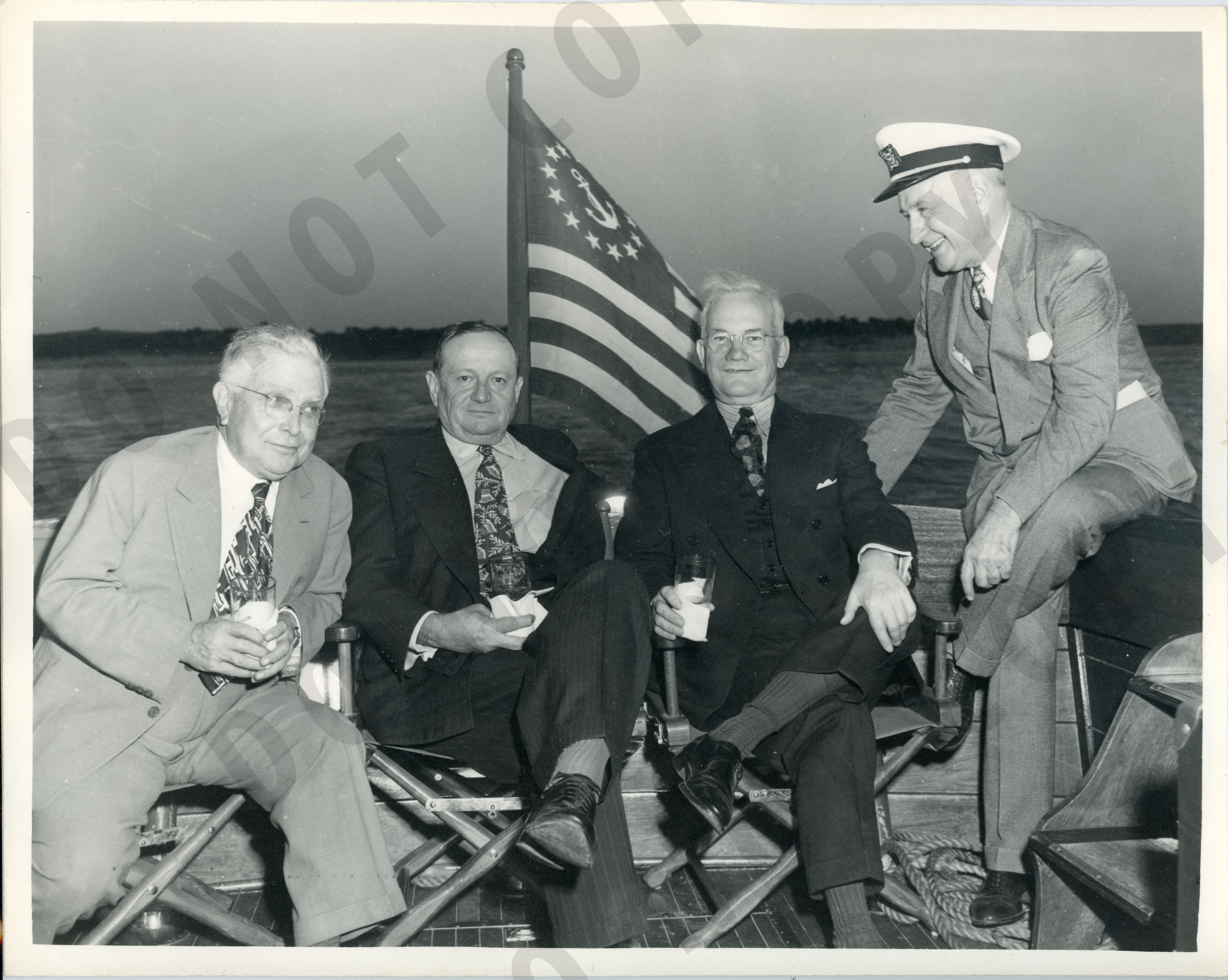Photo of aviation officials at a party at the Fort Worth Boat Club. Amon Carter, right; Sid Richardson, second from left.