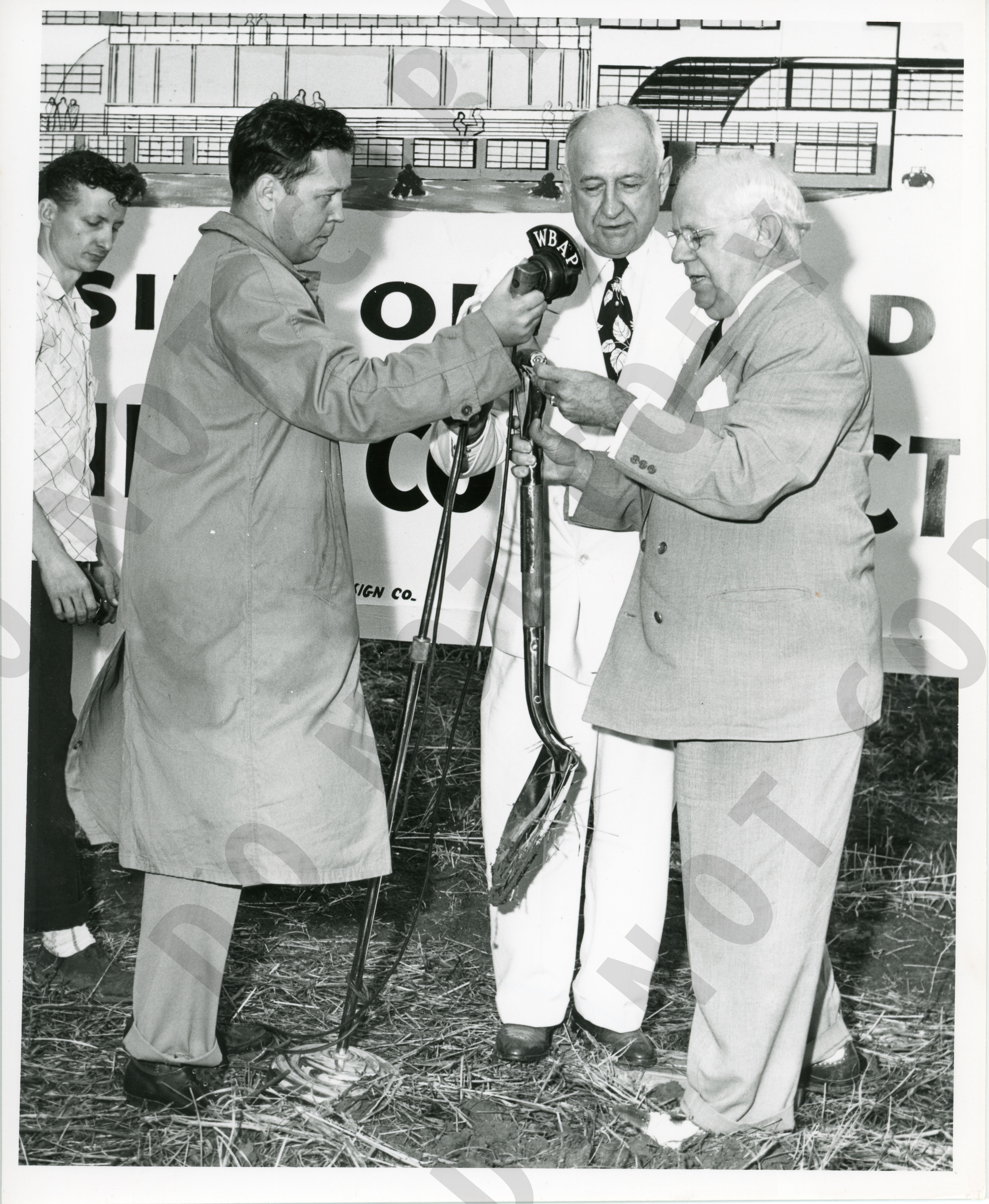 Photo of Amon Carter with three others at the groundbreaking ceremonies for the Greater Fort Worth International Airport.