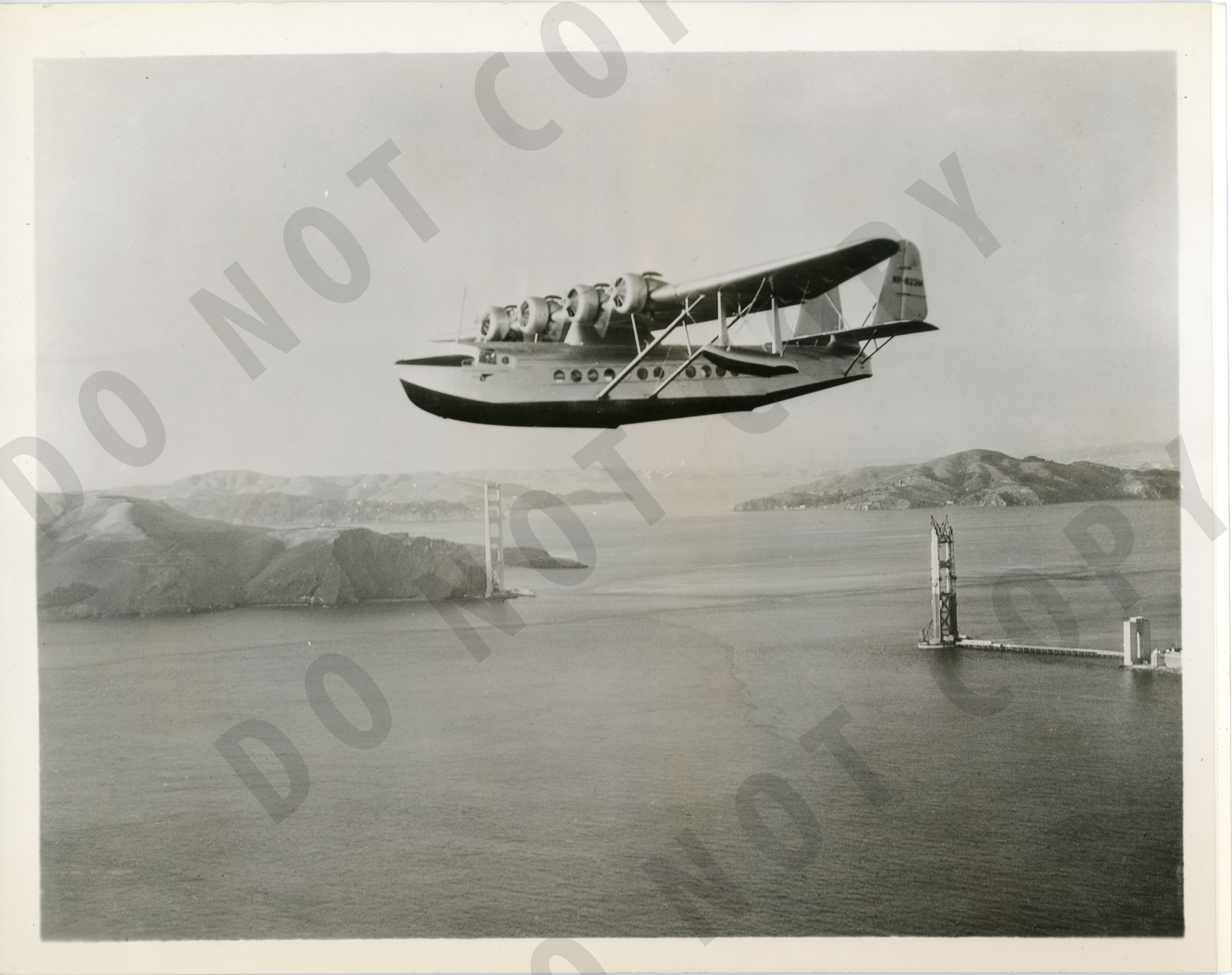 Photo of a plane flying. On reverse: "Trail-blazing Pan American Clipper leaving Golden Gate on firs flight California to Hawaii."