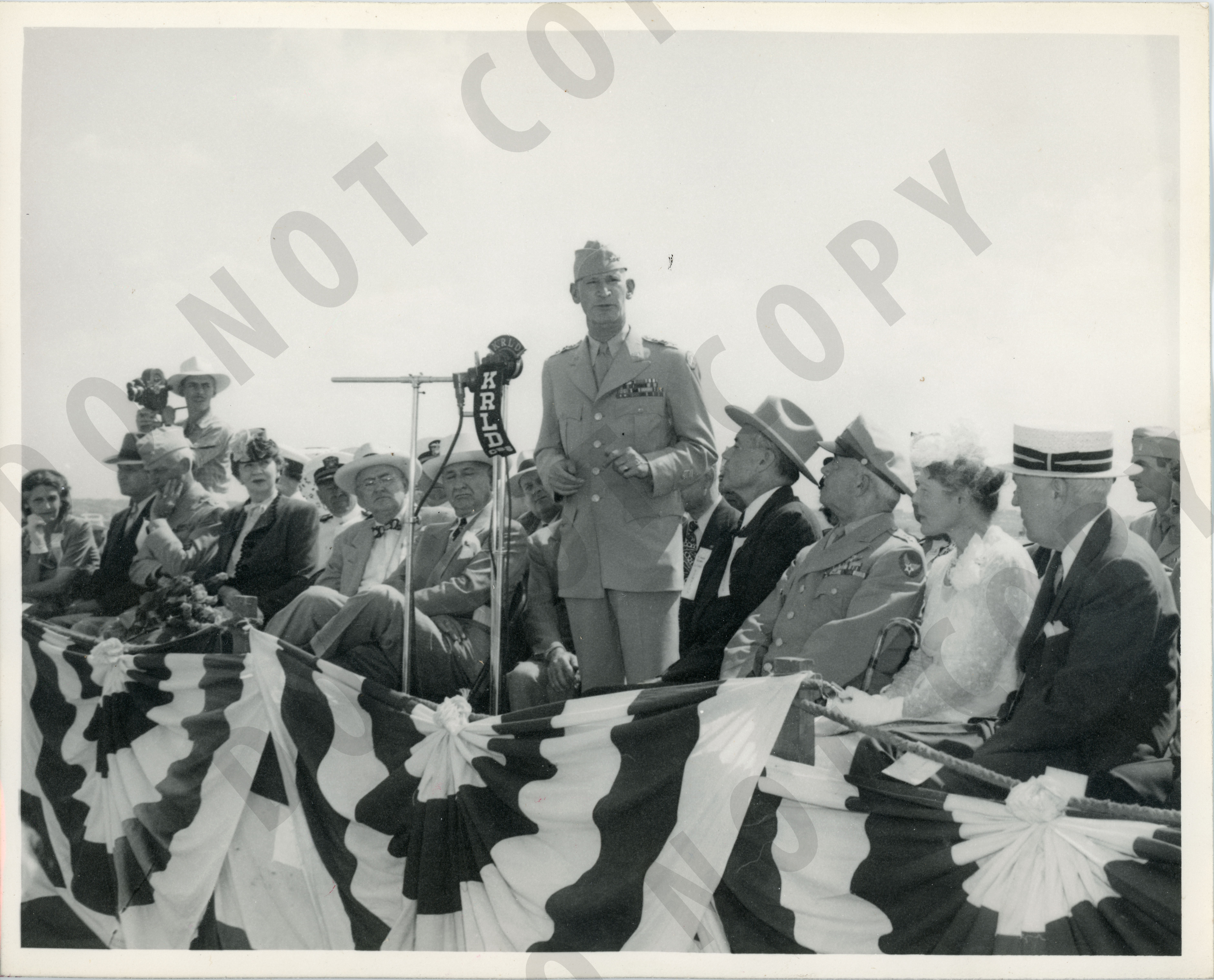Photo of Amon Carter with General William H. Simpson, and others visiting Fort Worth.
