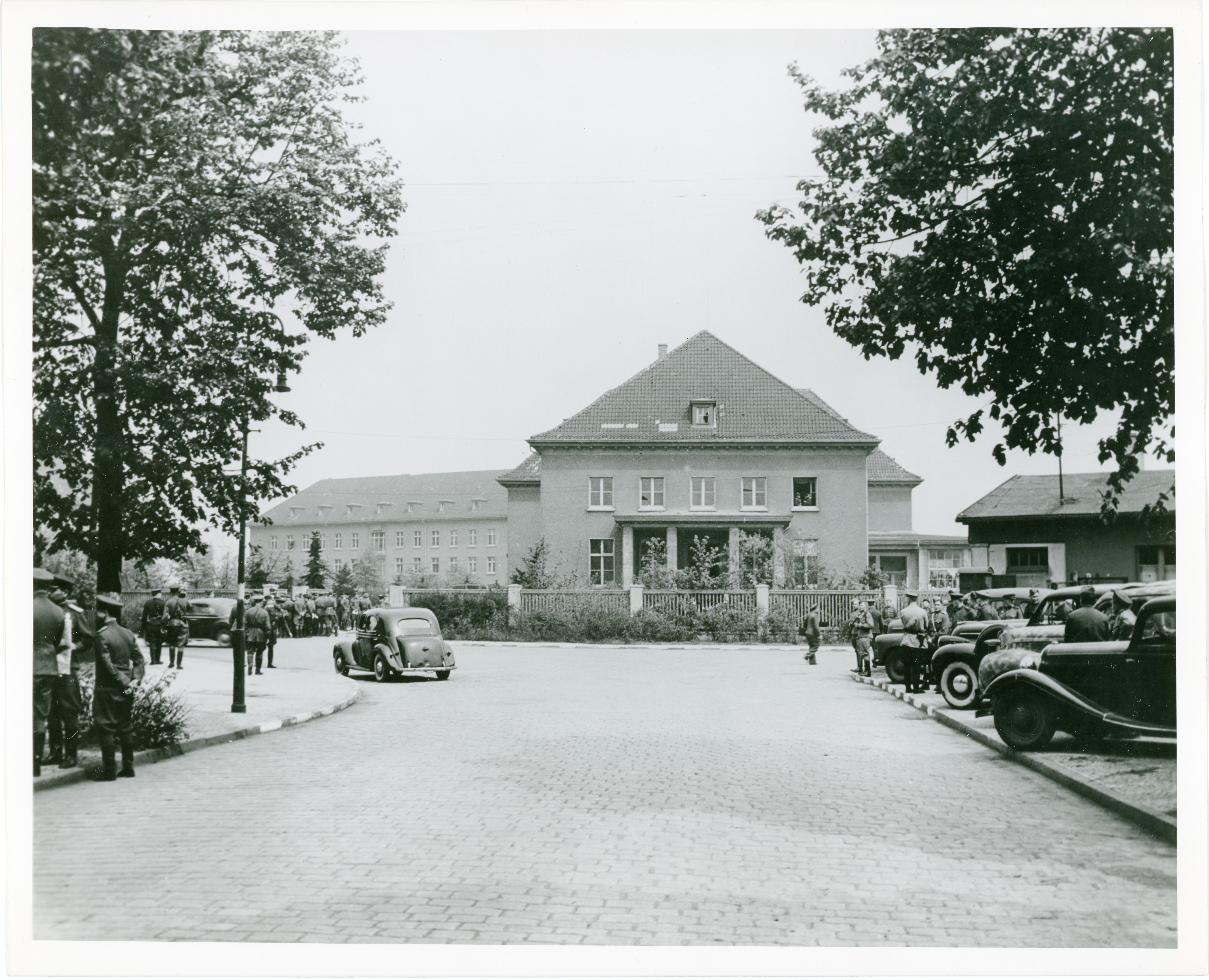 On reverse: "ETO HQ 45 27420 7 MAY CREDIT….SIGNAL CORPS PHOTO PHOTOG….LT MOORE 3908 FORMER GERMAN ARMY ENGINEERING SCHOOL IN BERLIN WAS THE SCENE OF THE SIGNING OF THE RATIFIED SURRENDER TERMS TODAY (14) CERTIFYING AS BEING PASSED BY OFFICE CHIEF PRESS CENSOR HEADQUARTERS ETOUSA ARMY PICTORIAL SERVICE BY P."