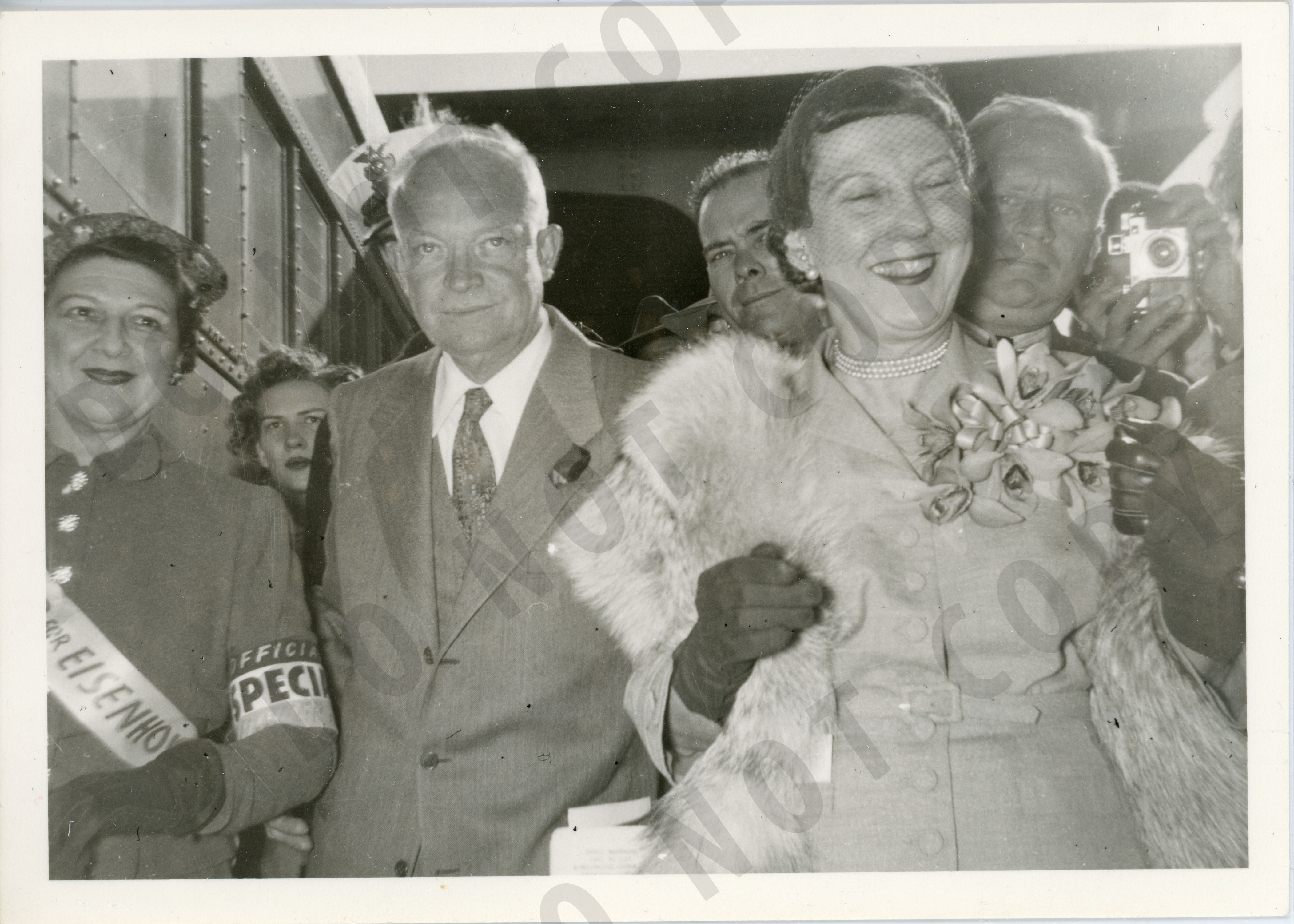 Photo of Dwight D. Eisenhower and Mamie Doud Eisenhower. On reverse: "Taken Oct 15, 1952 by Mrs. Henry W. Newton 2311 Daisy Lane Mrs. [Marie] Tarlton Gen Eisenhower, Mamie Eisenhower Tom McCann between Ike and Mamie Corsage given to "Mamie" by the Amon Carters."